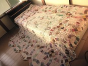 ヘキサゴン(六角形)のお花のアップリケを中心に、ダブルウエディングのパターンを配置したオリジナルデザインの本格的キルトです