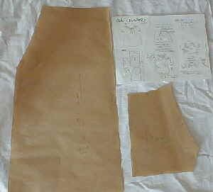 布の上にのせた茶色の実物大型紙の型とおりに裁断して、布端を合わせて各縫い代の幅で縫い合わせていきます