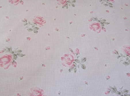 約3mm間隔の手書き風チェックに愛らしい丸みのあるピンクローズのプリント